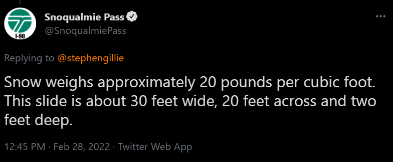 Discussing snow with the Snoqualmie Pass WSDOT account on Twitter - the passes appear to clear and wet, but avalanche risk keeps them closed. They just had a big slide fall on the road: